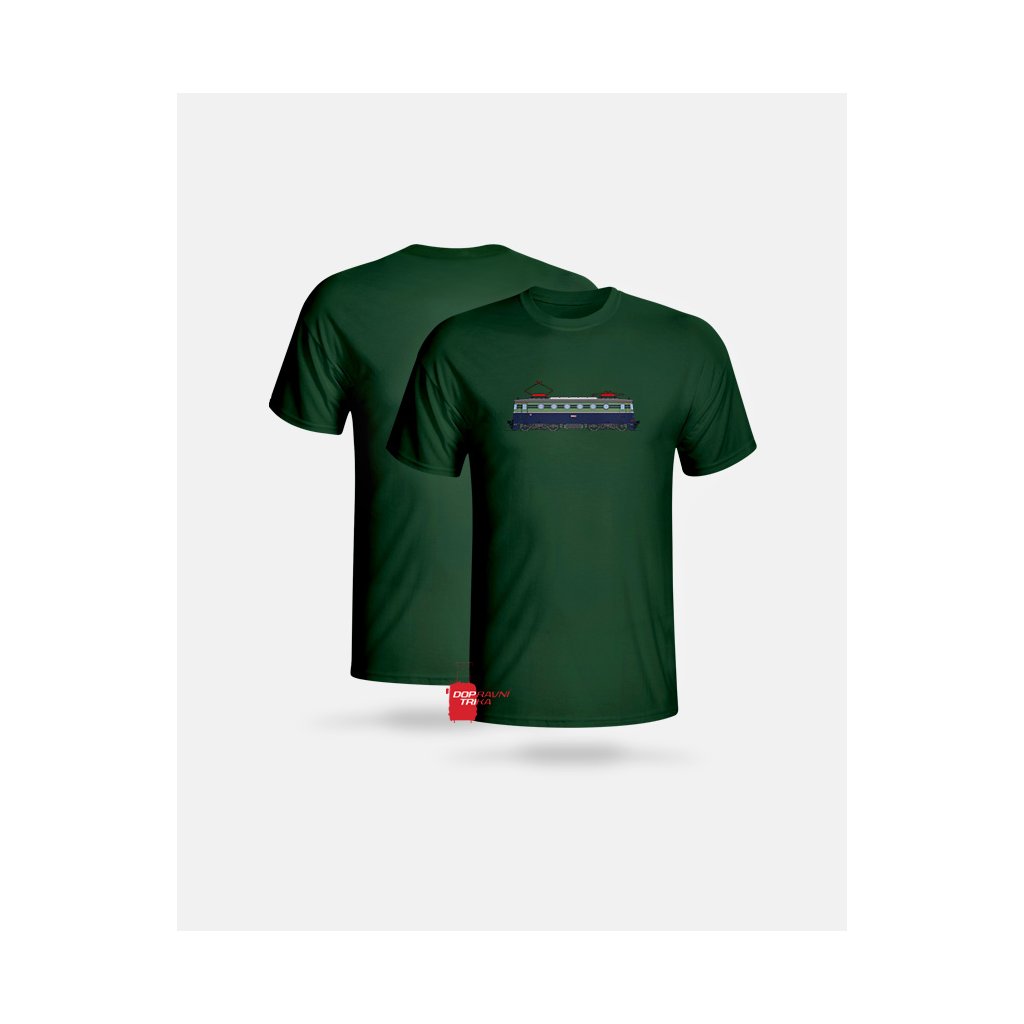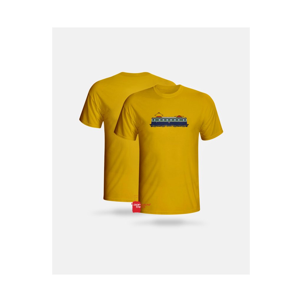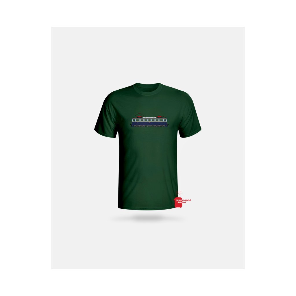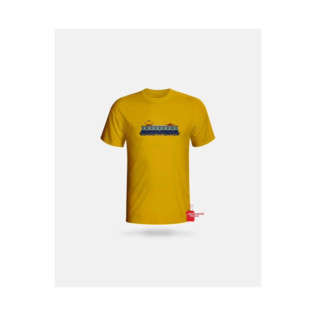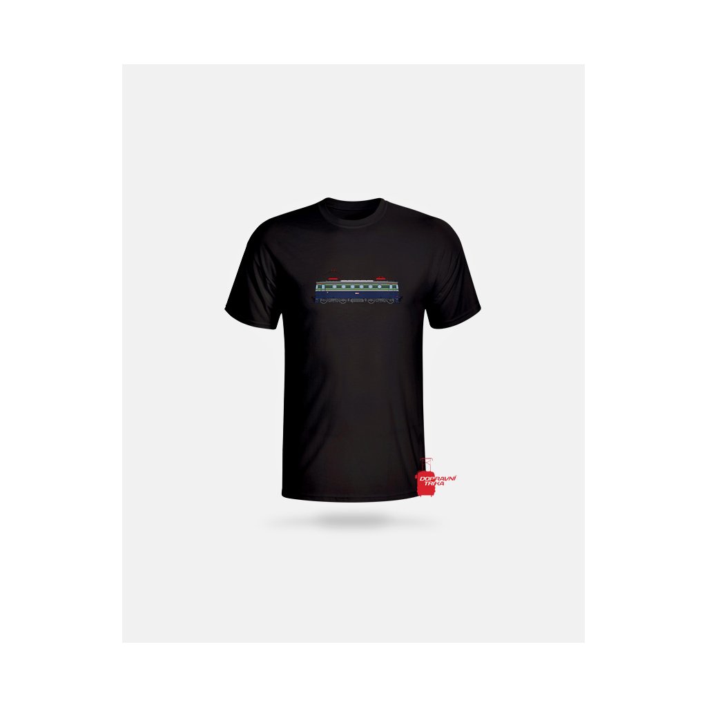 Triko s barevným motivem elektrické stejnosměrné lokomotivy E499.0004 / 140.004 (Bobina) v modrém nátěru.